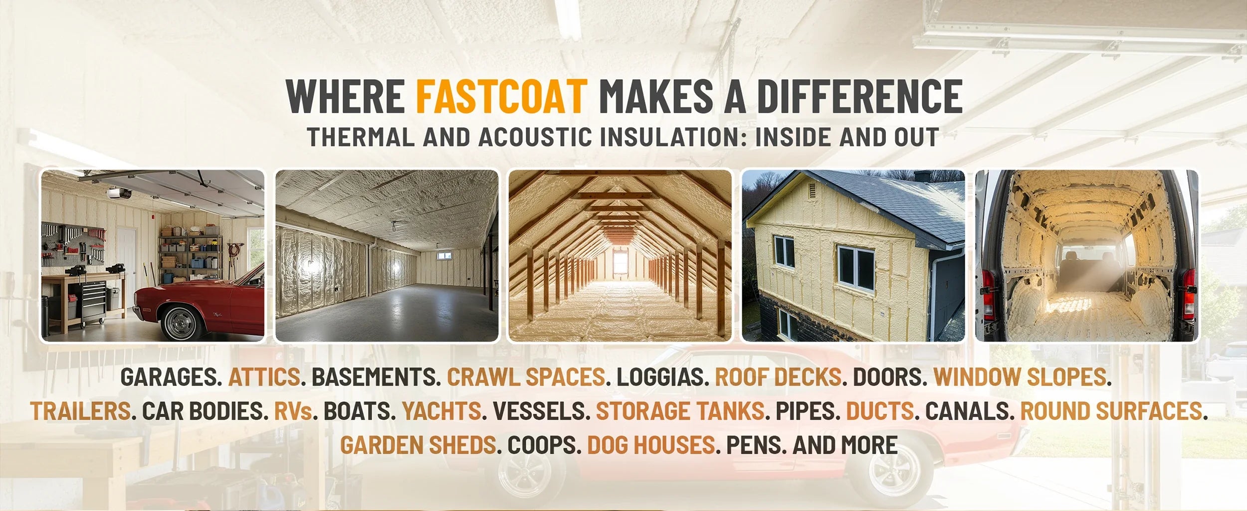 FastCoat adheres to wood, drywall, masonry, concrete, metal, and rigid foam boards. Surfaces must be clean, dry, and free of oil, dust, or rust.